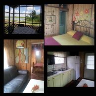 The Cottages sit atop a 60 foot tall hill overlooking the country side, the vineyard and the lake. Flanked by woods and pasture, the view is breathtaking. The cottages are each unique in size and style. Three of them have open porches and low rise ramp entrances. The larger ones have full kitchens and all have a 3/4 bath. All of the cottages have televisions in the bedroom and living room. The living room T.V.s have a DVD player.
