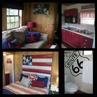 This Route 66 cabin is decorated in an Americana theme and sleeps 2-4 people with a Queen bed in the bedroom and a Full size sleeper sofa in the living room (not recommended for adults). The screened in porch has curtains and lounge chairs. Air conditioned. Pets Allowed with fee